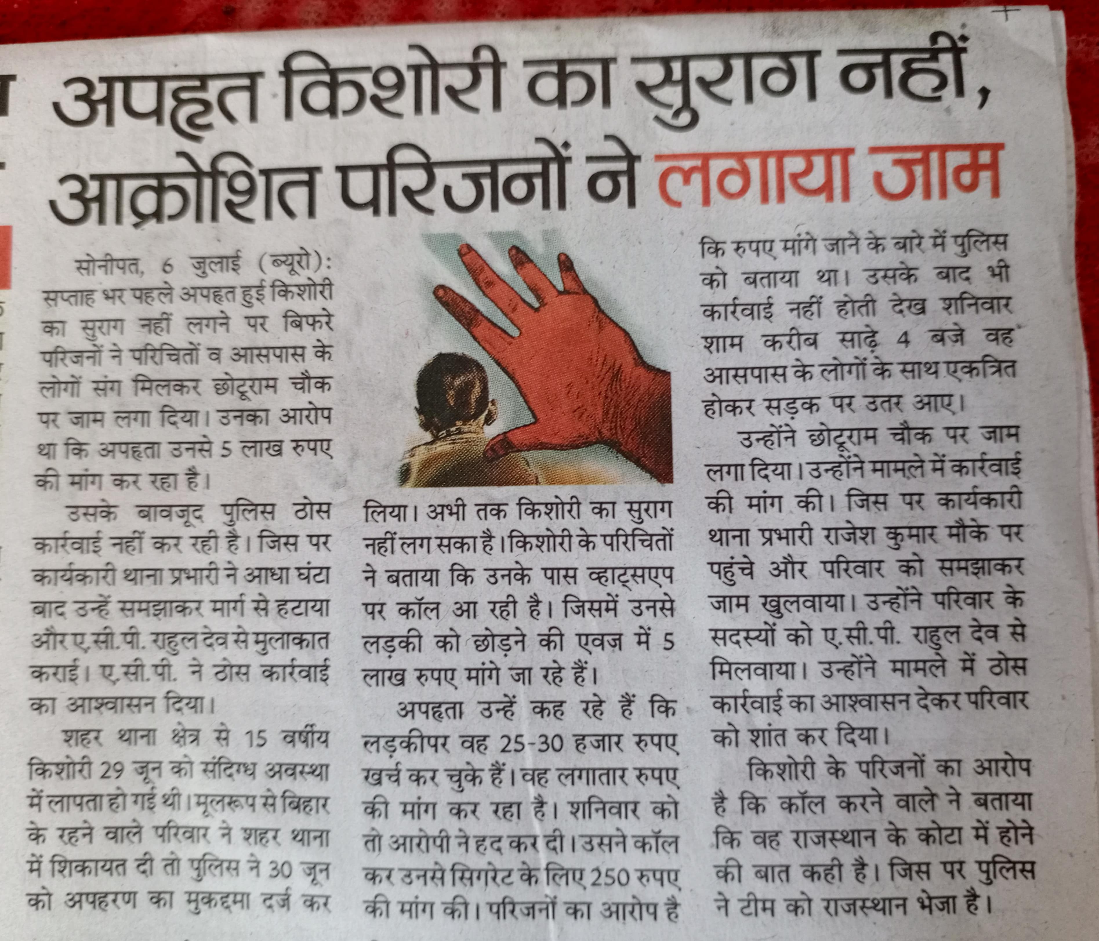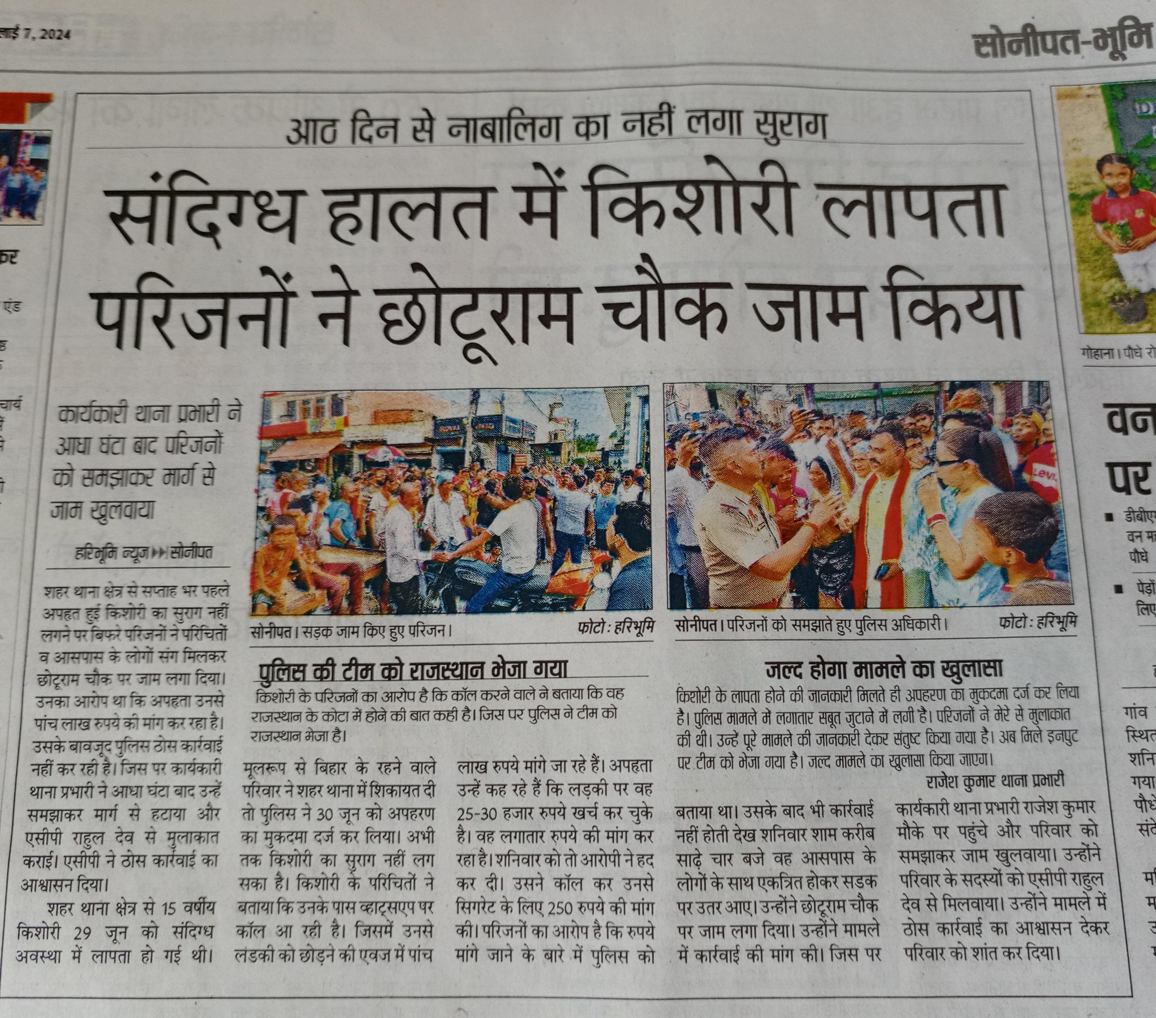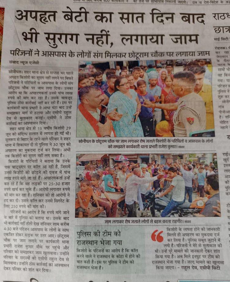 बच्ची की बरामदगी के लिए छोटूराम चौक पर अभिभावकों ने लगाया जाम