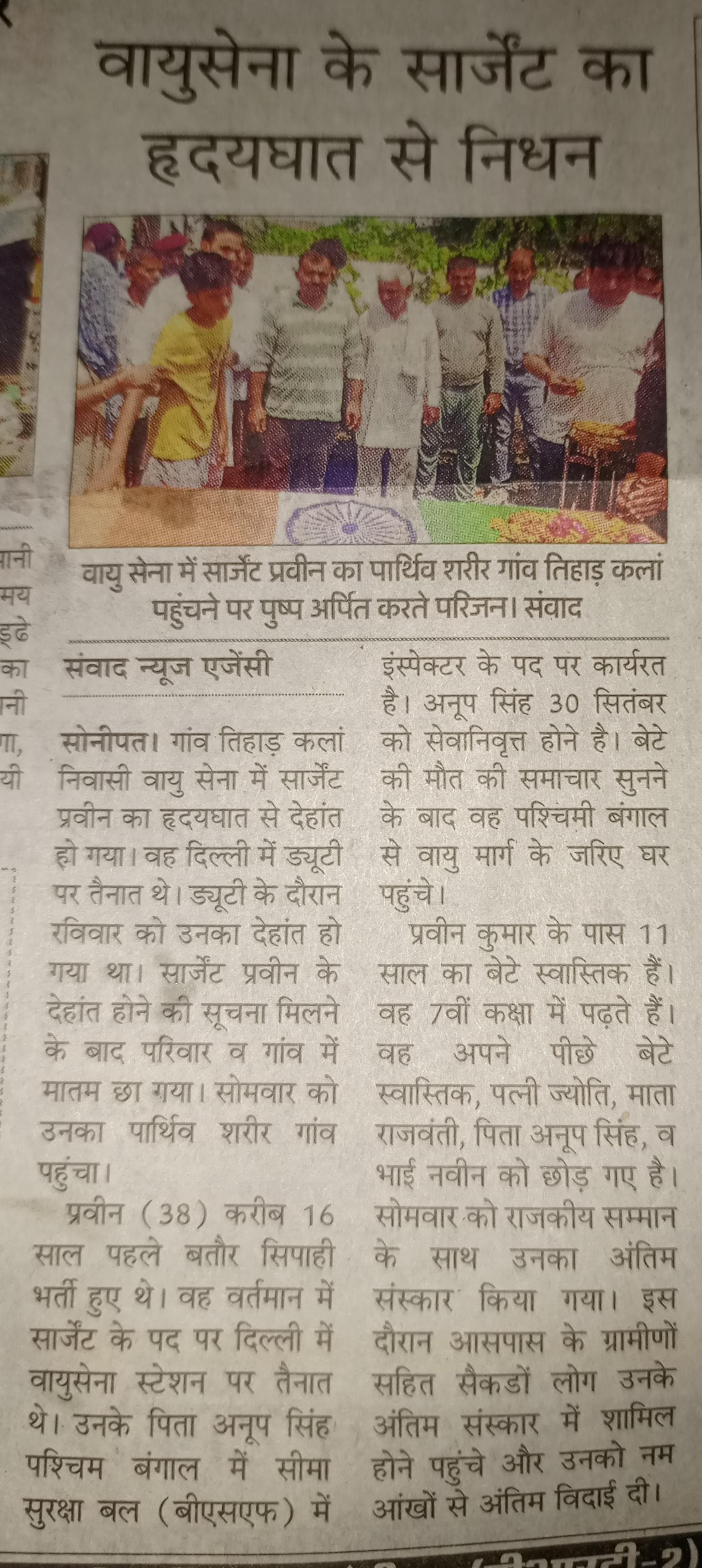 वायुसेना सार्जेंट के पार्थिव शरीर पर पुष्प अर्पित किए मनजीत तिहाड़ा और ग्रामीणों ने