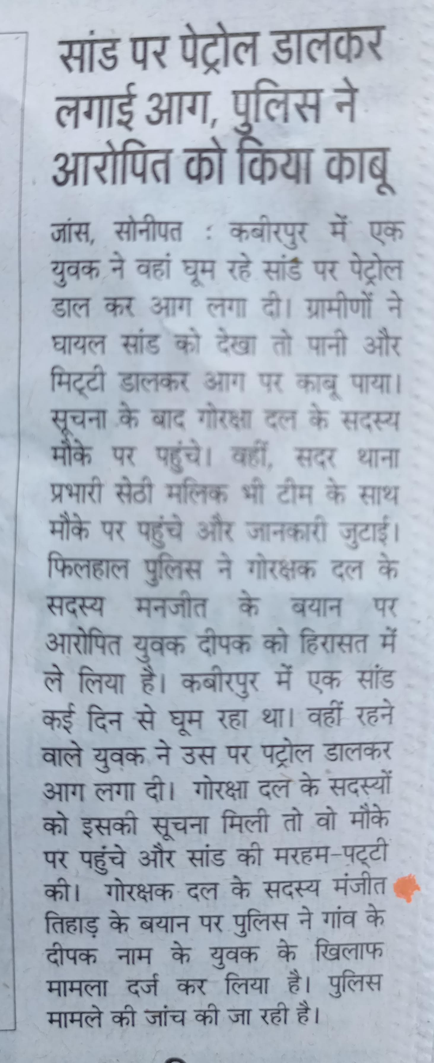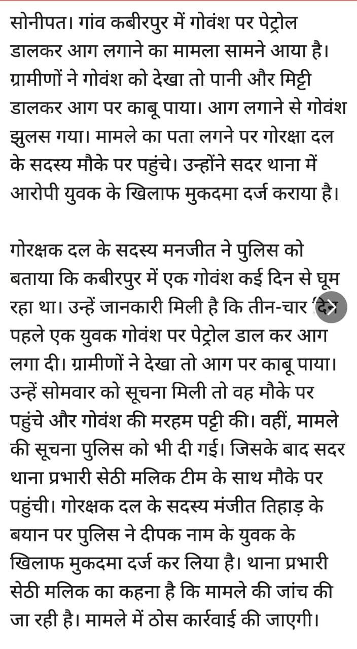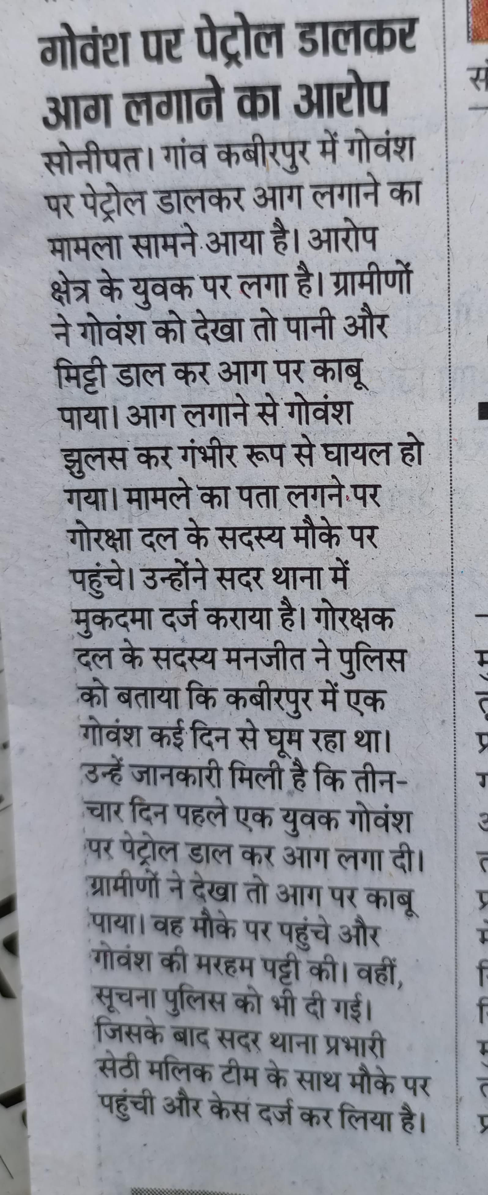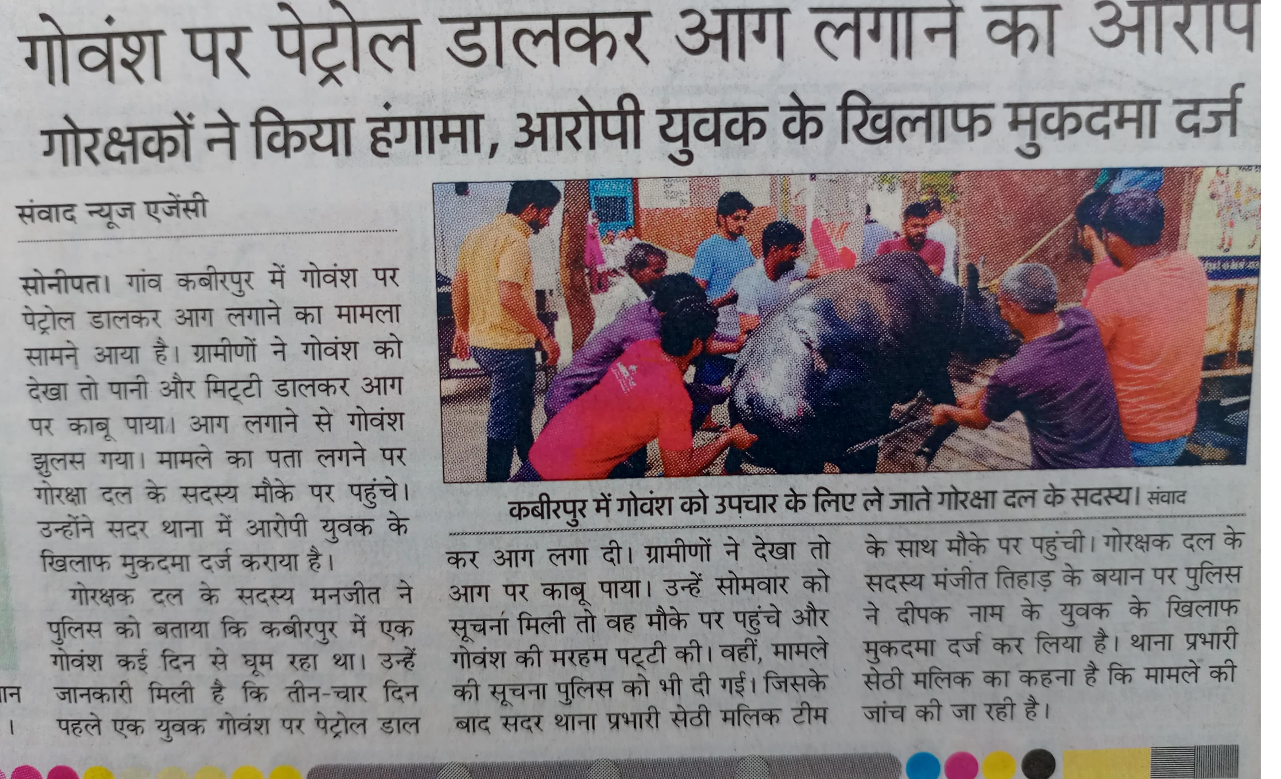 गौ वंश पर पेट्रोल डालने का आया मामला