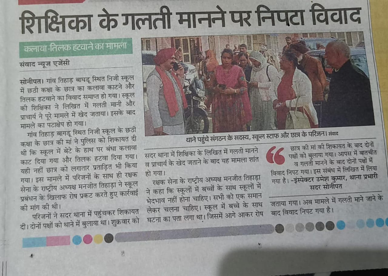 हिन्दू बच्चों का कलावा कटवाना और तिलक हटवाने बिल्कुल सहन नहीं करेगी रक्षक सेना मनजीत तिहाड़ा ने की अगवानी