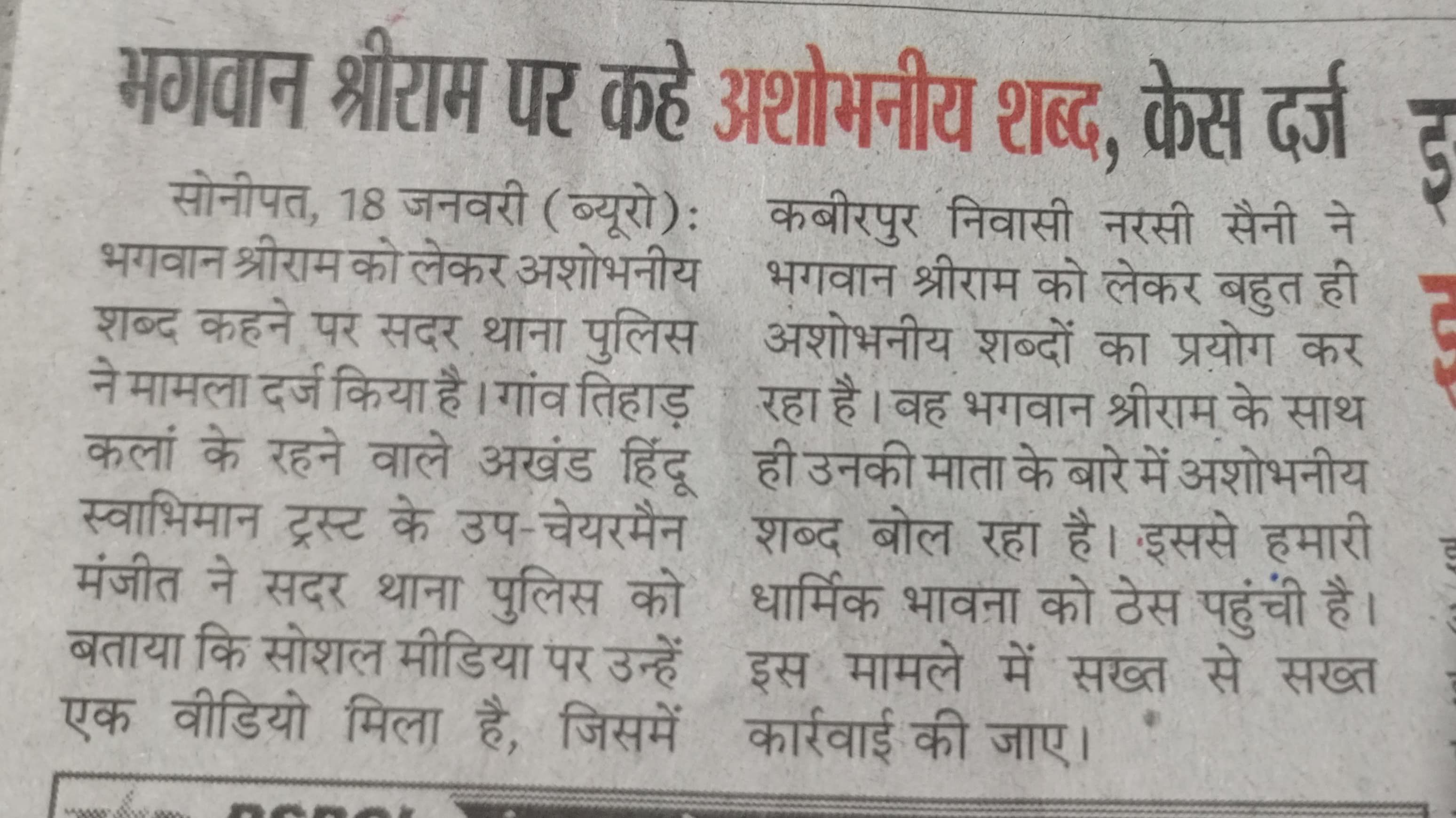 भगवान श्री राम और उनकी माताजी के प्रति कोई भी गलत शब्द बर्दास्त नहीं होगा :- मनजीत तिहाड़ा