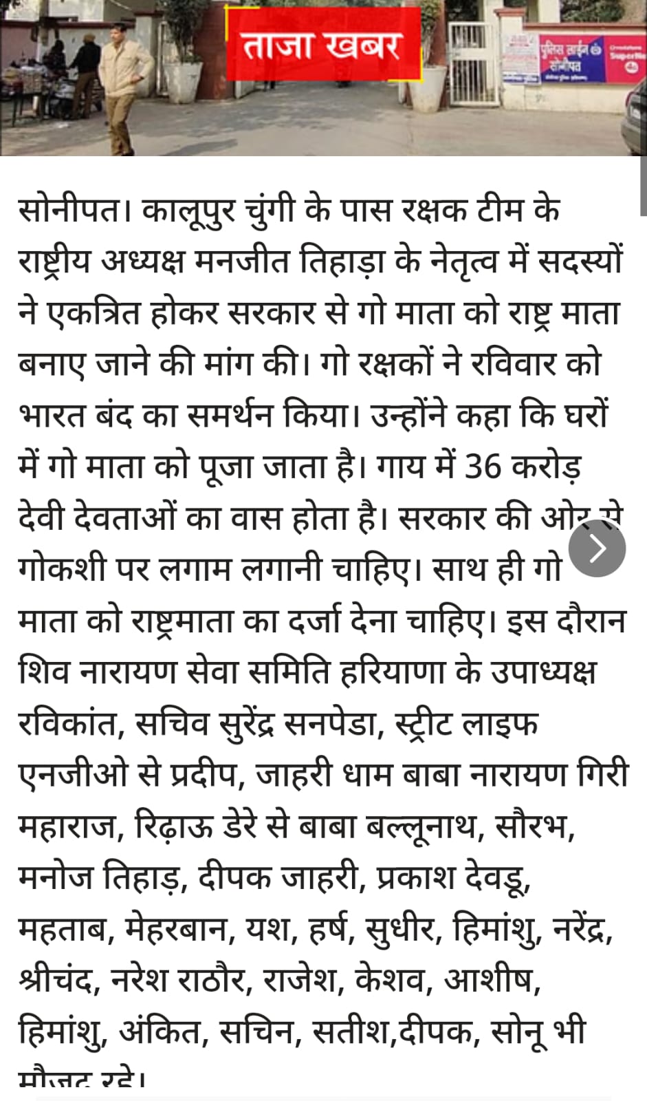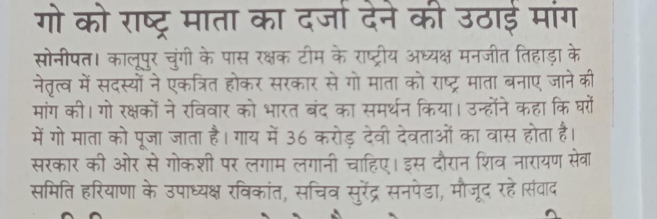 मनजीत तिहाड़ा के नेतृत्व मे गौ सेवकों ने गौ माता को राष्ट्र माता बनाने के लिए आवाज की बुलन्द