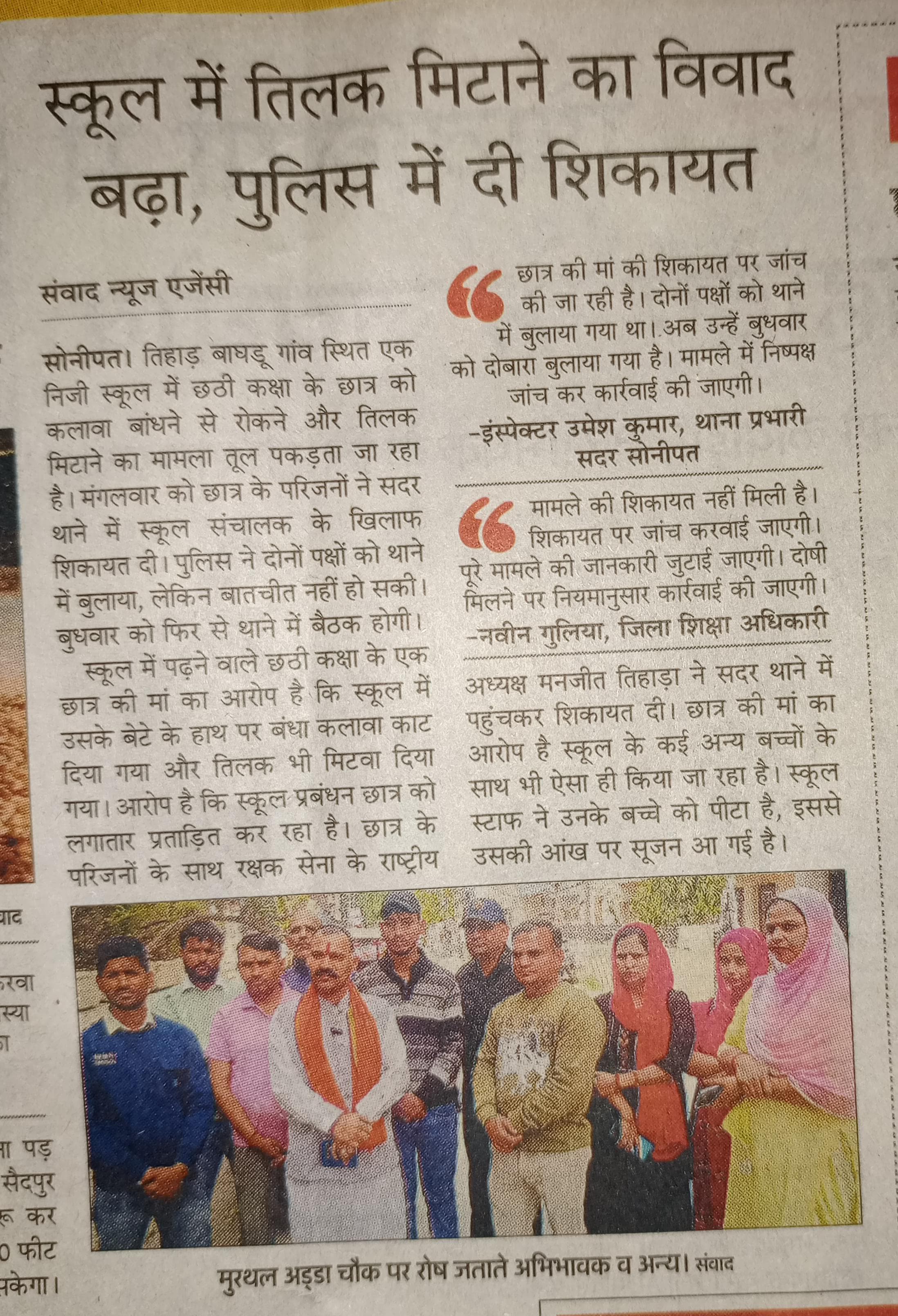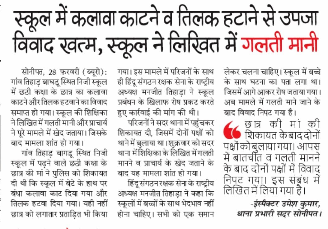 .कलावा तिलक मामले में हिन्दुओं की हुयी जीत, रक्षक सेना और हिन्दू संगठनों ने की थी आवाज बुलन्द