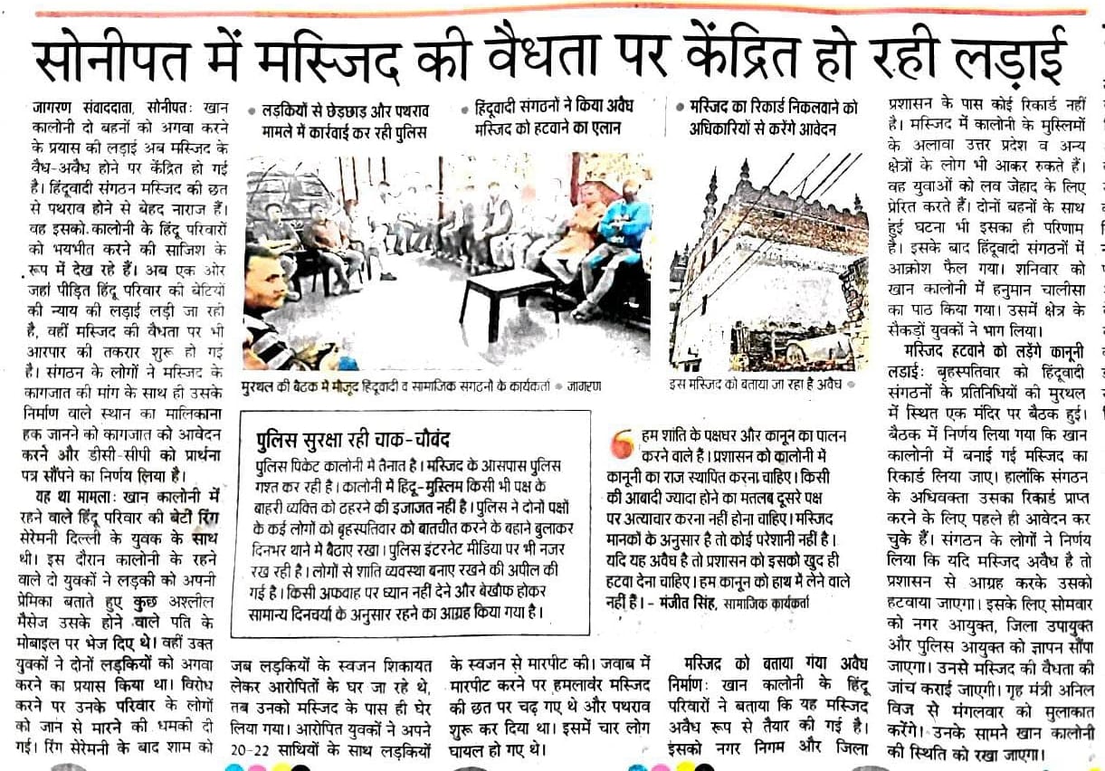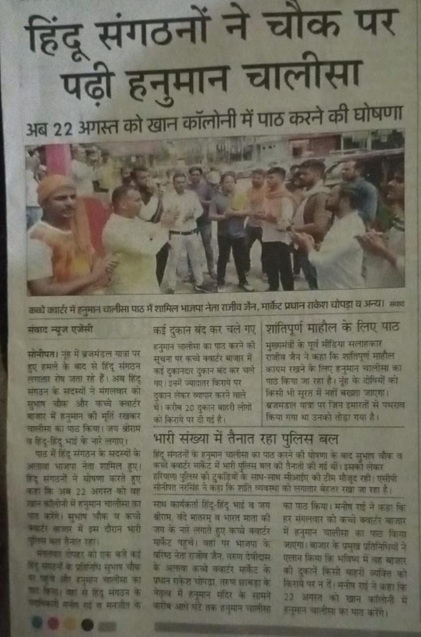 मनजीत तिहाड़ा,हिन्दू संगठनों ने हिंदुओं के साथ मिल कर खान कोलोनी में पढ़ी हनुमान चालीसा