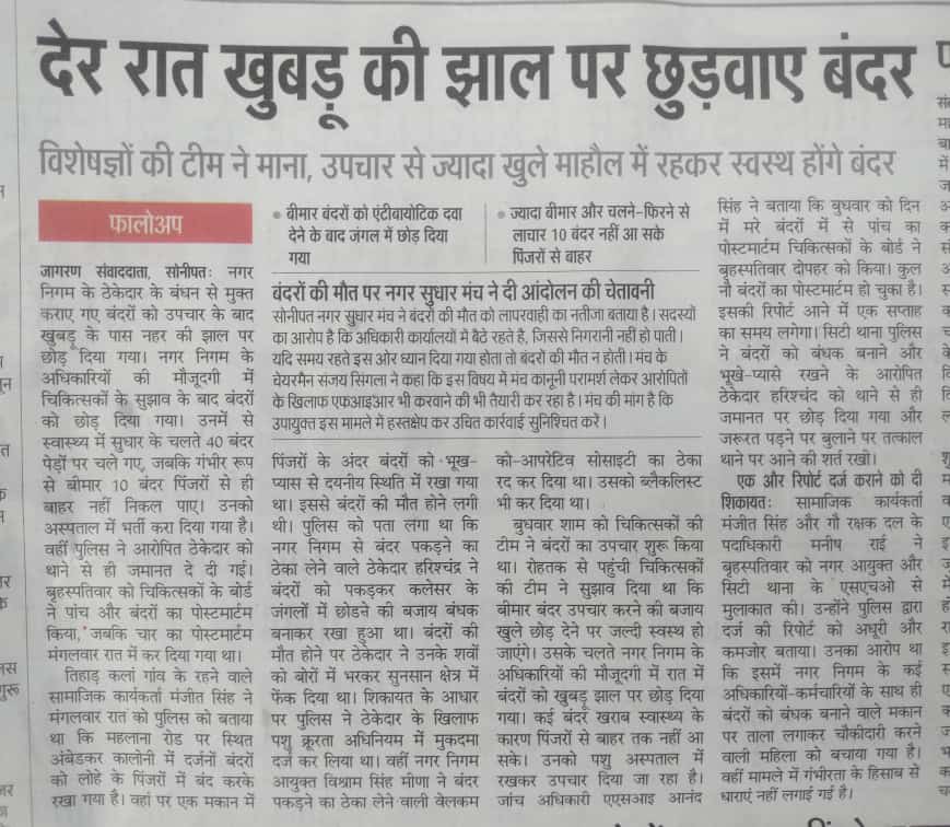 बन्दरों की जान बचाने के लिए मनजीत तिहाड़ा ने उठाई आवाज बन्दरों को करवाया आजाद