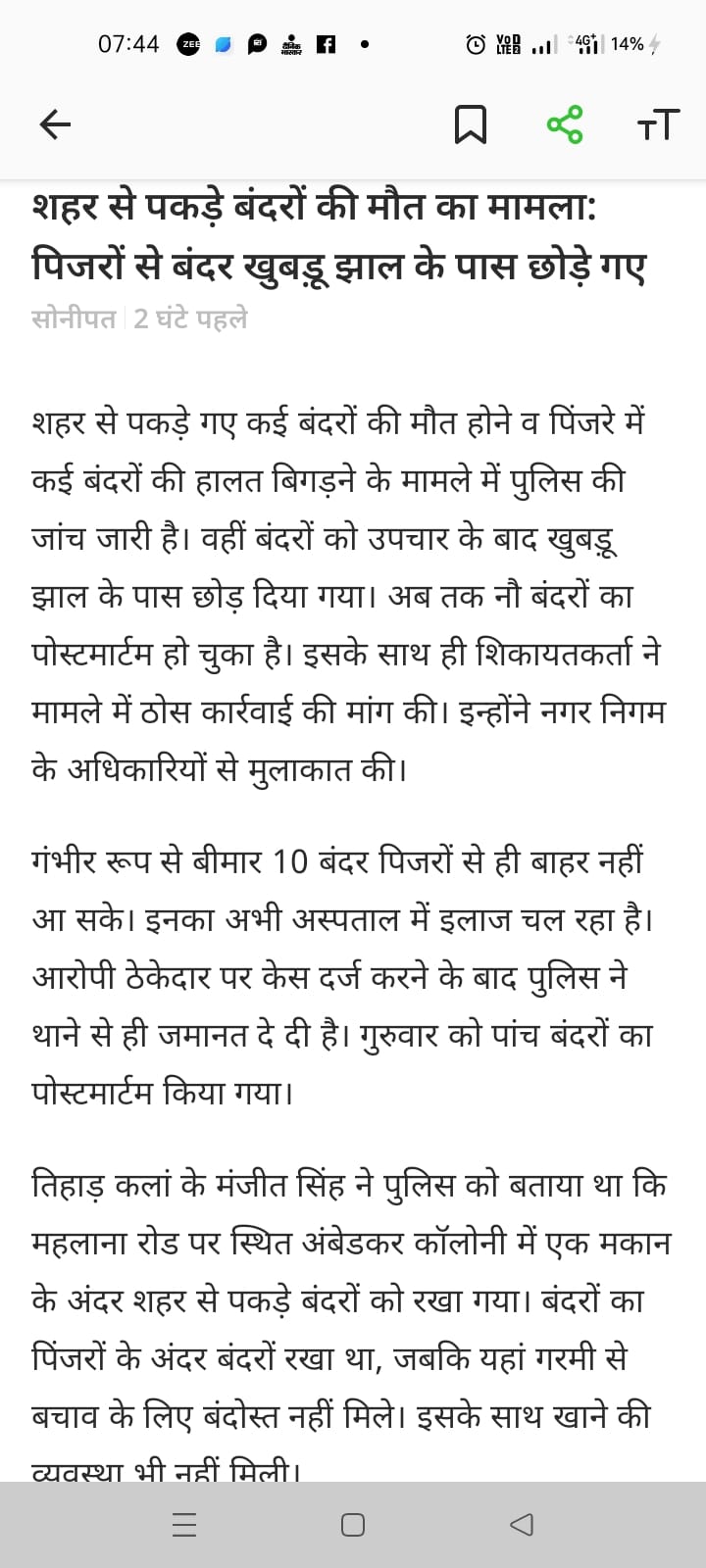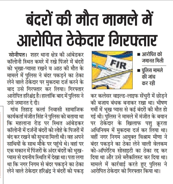 बन्दरों को शोषित करके मारने वाले मामले में मनजीत तिहाड़ा ने शिकायत देकर ठेकेदार को कराया ग़िरफ़्तार