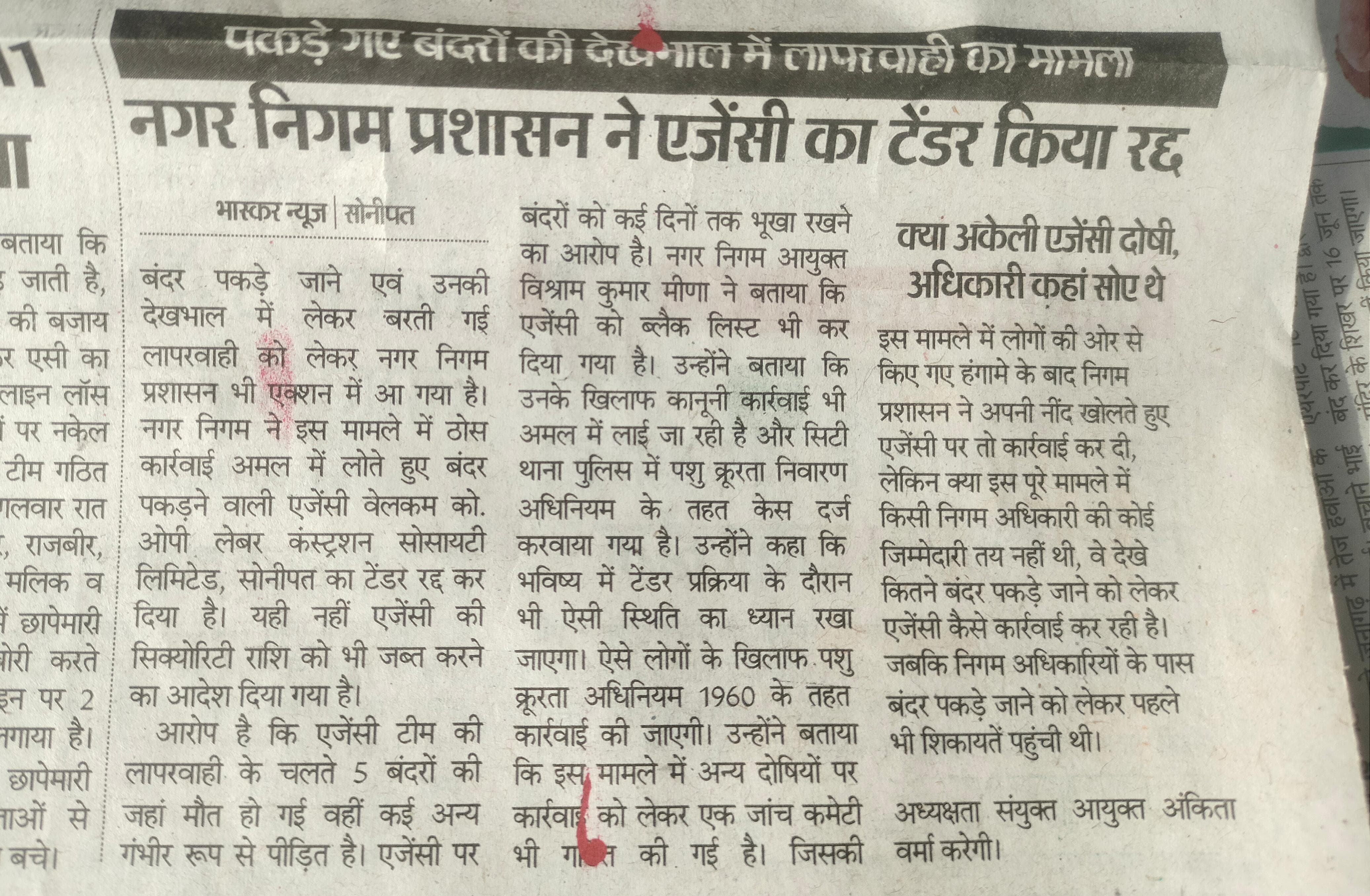 वानरों के मृत पाए जाने, भूखा प्यासा रखने पर शिकायत देकर कम्पनी को ब्लैक लिस्ट कराया मनजीत तिहाड़ा ने