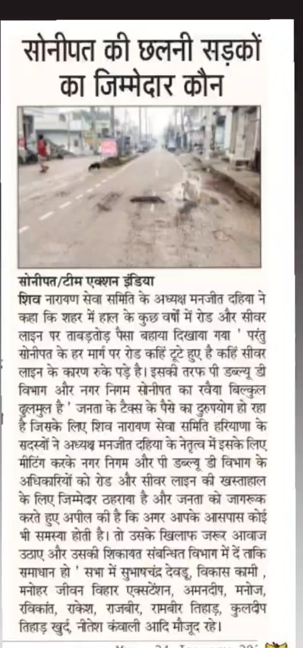छलनी सड़कों की मरम्मत के लिए आवाज उठाई शिव नारायण सेवा समिति के अध्यक्ष मनजीत तिहाड़ा ने