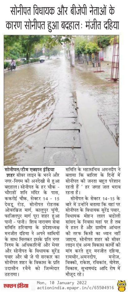 सोनीपत के विधायक और बीजेपी नेताओं के कारण सोनीपत हुआ बदहाल :- मनजीत तिहाड़ा