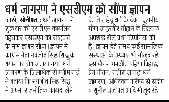 धार्मिक भावनाओं के आहत होने पर मनजीत तिहाड़ा, धर्म जागरण से अन्य साथियों ने मिलकर S.D.M को सौंपा ज्ञापन