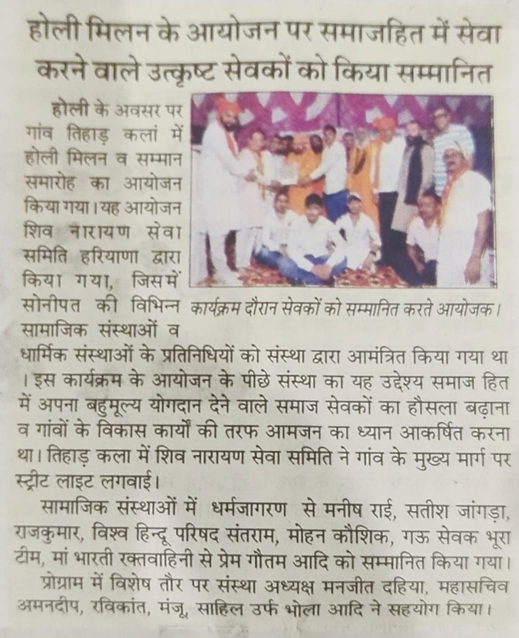 मनजीत तिहाड़ा के नेतृत्व में शिव नारायण सेवा समिति ने होली मिलन समारोह पर समाजसेवियों को किया सम्मानित साथ में गांव की महिलाओं की सुरक्षा को मद्देनज़र रखते हुए रोड पर लगाई स्ट्रीट लाईट